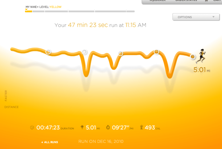 My super-awesome-wonderful friend gave me a Nike+ Sportband as an early Christmas present to track my distance, time, pace and calories burned as I run. Win!
