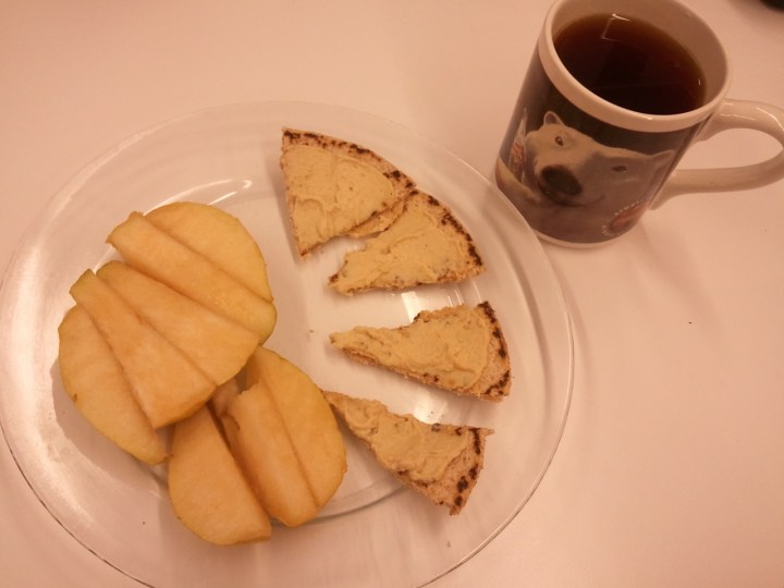 A perfectly ripe pear, half a toasted flatbread with hummus and black tea for second breakfast (the first was oatmeal). What, you don’t have second breakfast?