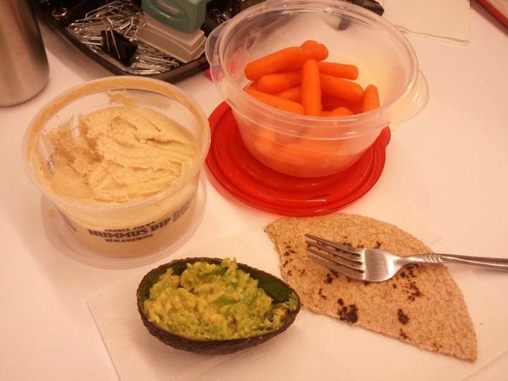 Pre-lunch snack: half flatbread, half avocado mashed with a fork, carrots and hummus. I also ate a banana.
