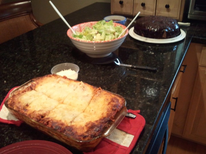 Aaron’s mom does not disappoint! Lasagna from scratch, Caesar salad, chocolate cake from scratch. Not pictured: Texas toast and homemade vanilla ice cream.