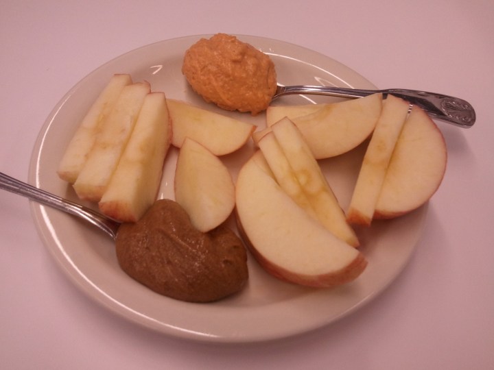 Happy Friday! Free (work-provided) apple with almond butter and tomato-basil hummus for second breakfast.