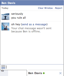 So I missed the boat on Facebook chat due to the terribly important work I was doing in other windows, but you heard it here first, people.