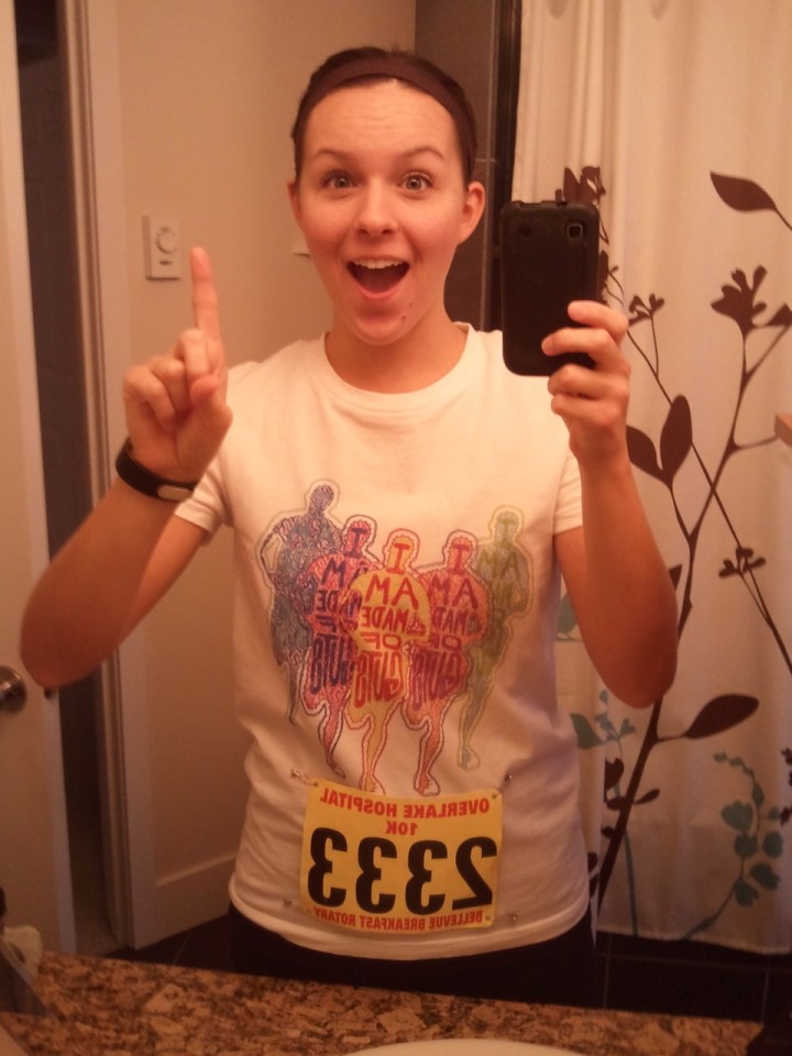 And my annoying shin pain was never a problem in this race – even now, only my knees hurt a little from nearly an hour’s worth of impact. I think taking four days off to rest, then doing only 3-milers, then taking two more rest days right before the race did the trick!