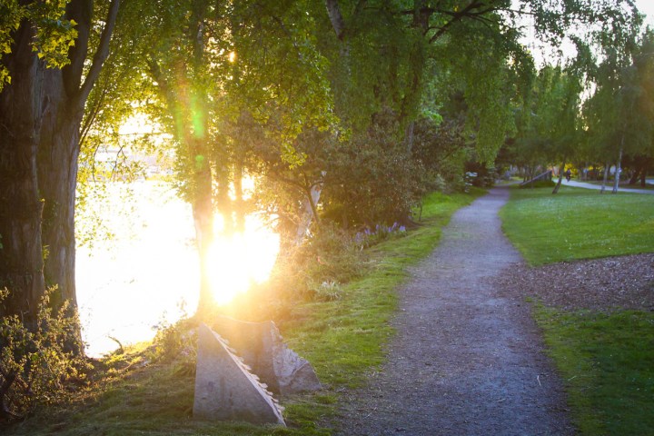 The first few miles were uneventful. I concentrated on trying to slow down, and was really happy with my splits for miles 2 through 7 (9:13, 9:24, 9:23, 9:28, 9:11, 9:15). Around mile 6, the course dipped down to Lake Washington Boulevard, which is a beautiful stretch of road along Lake Washington. The weather was cloudy, but not nearly threatening rain, and the coolness was even nicer with a little breeze coming off the lake.