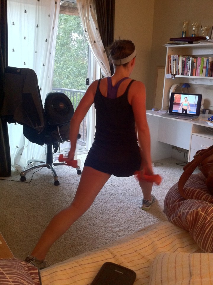 Jillian Michaels’ “No More Trouble Zones” DVD. Aaron creeped on me while I was nerdily doing this in my room. Wheeeee!