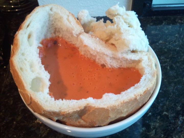 DIY bread bowl, starring half of a sourdough round and Safeway’s Tuscan Tomato & Basil Bisque.