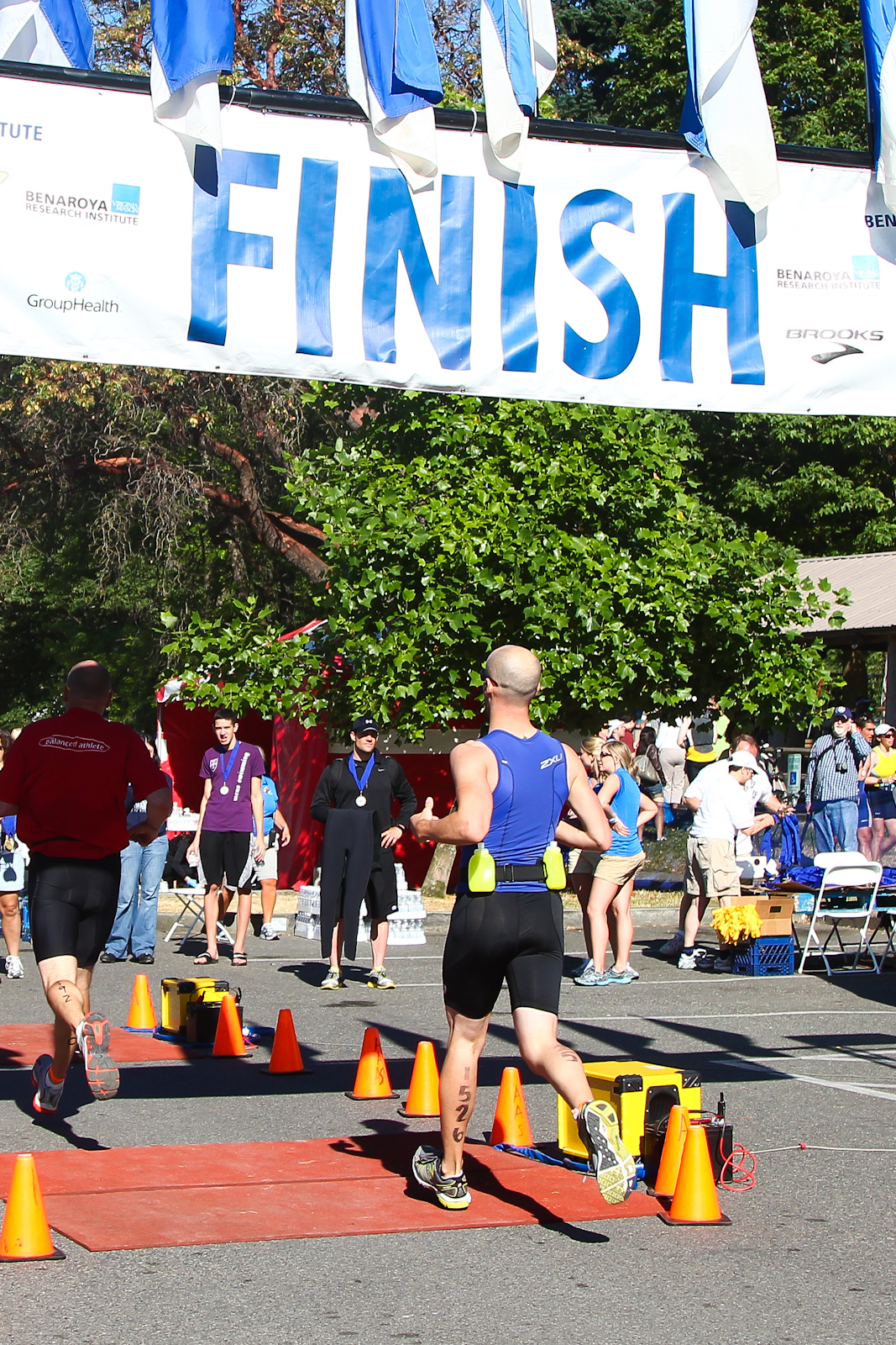 The bike-dismount area had a really sharp corner that caused many athletes to stumble and/or crash into one another as they scrambled to get into the transition area, but Aaron did just fine with it!