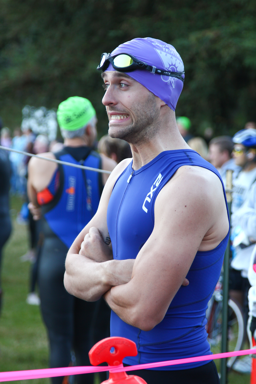 He had a sweatshirt and sweatpants, but he insisted on getting acclimated to the cold since he didn’t have a wetsuit to wear for the swim. I’d say 95% or more of the athletes wore a wetsuit, but Aaron rolled just a tri top and tri shorts for his first race!