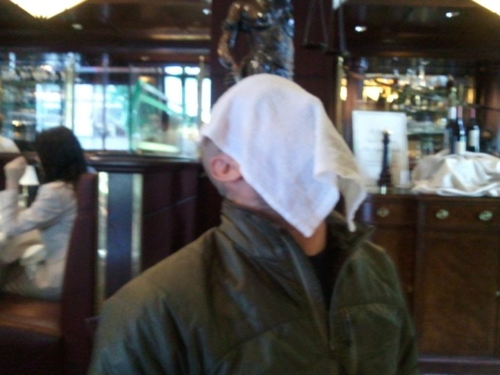 Aaron and I just had lunch at a fancy-schmancy place across from our office (they have fantastic cheeseburgers and truffle fries) and he gave himself a nice steam facial with the hot, lemon-scented towel.