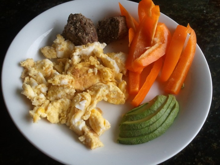 Breakfast: Leftover steak, two eggs, ¼ orange bell pepper, ¼ avocado. Yum!