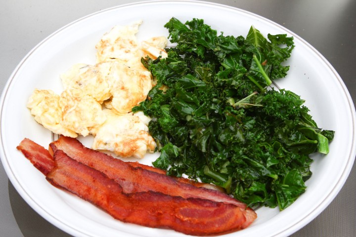 Here’s another repeated meal (but new photo): Bacon, eggs and kale.