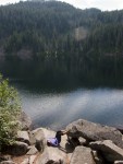 Once we got to the lake — a gorgeous, still, mirror-like alpine gem — we lunched on PB&J sandwiches, apples and snap peas. I also took the opportunity to relax on a flat rock and soak up the sunshine. I could’ve napped there for a few hours at least, but Aaron preferred to head back down… sighhh.