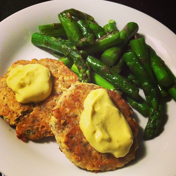 Homemade Paleo dinner: Salmon cakes with ginger mayo and asparagus.