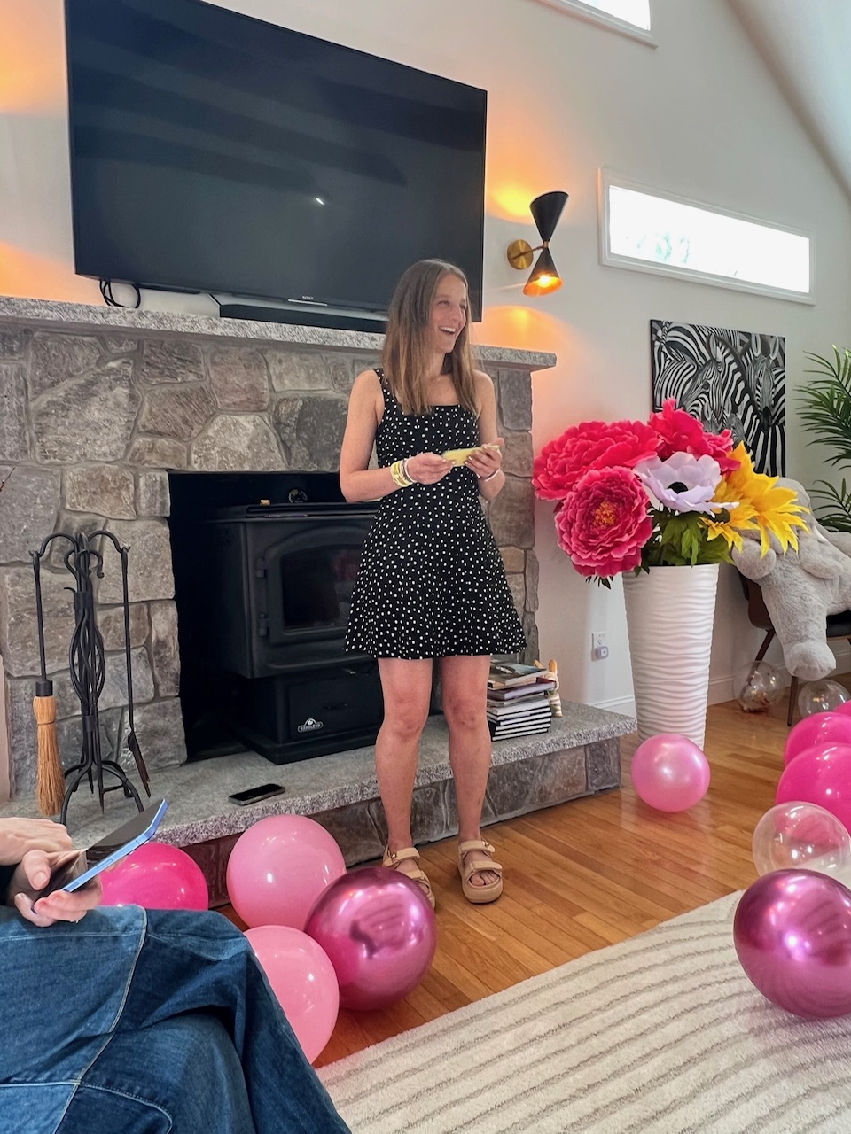Once we were all fed and showered, it was time to prep Ali’s house for the party. A creative group got to work on the decorations while I snuck upstairs to dry my hair and put on makeup (I had the limited bathroom space on my mind and wanted to get it out of the way). Then I helped with food and drink prep, plus setting up plates, utensils, and such. Assembling two charcuterie boards was my crowning achievement. I’m no Martha Stewart, but I did my best!